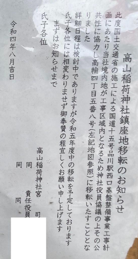 高山稲荷神社が国道15号拡幅のため移転