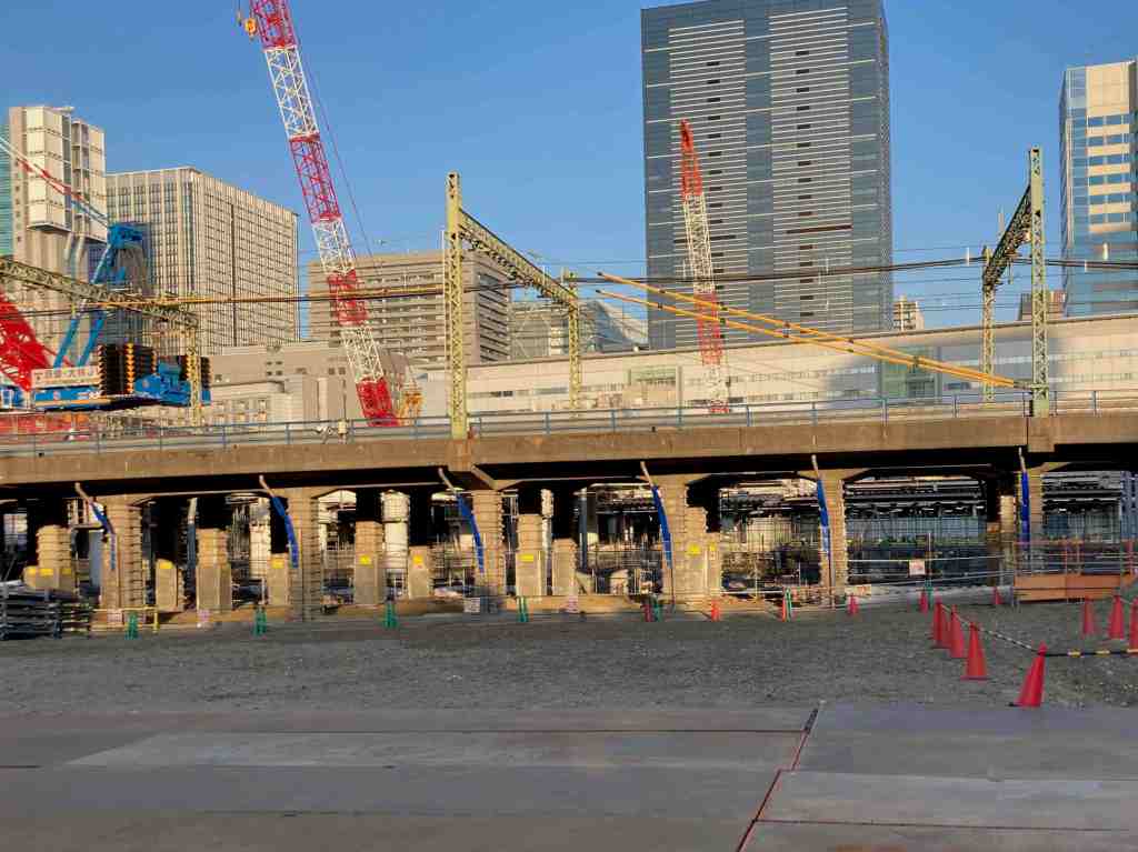 その右側では、京急線の高架橋仮設化が、その奥では品川駅北口広場の工事が進んでいます。