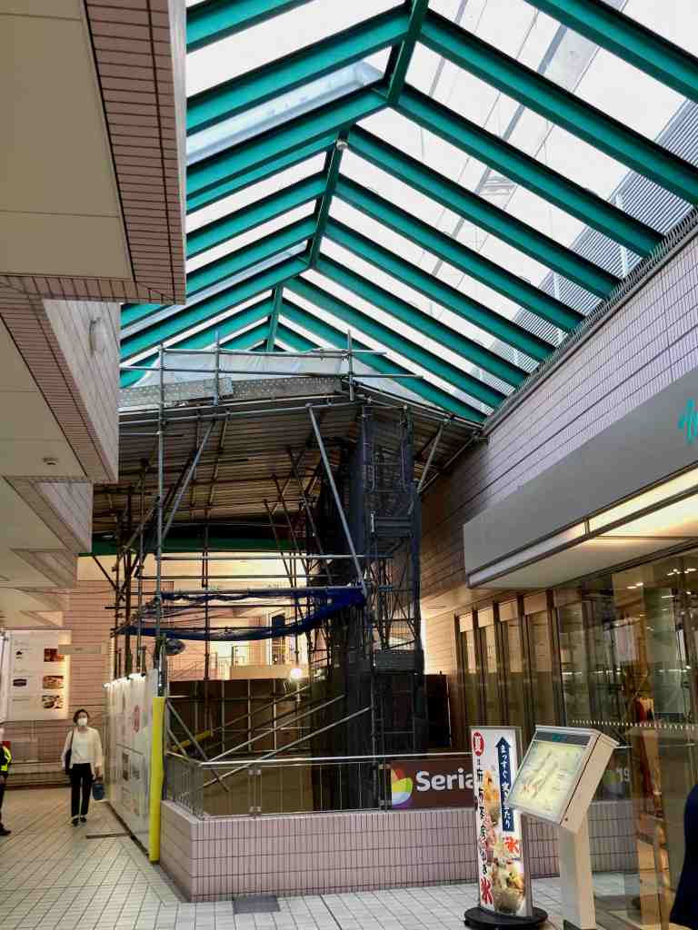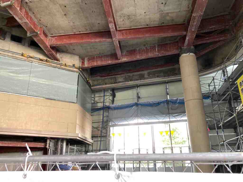 一方で、一階では、解体部分が通路となっているので、解体工事の様子を見ることができます。現時点では内装が撤去され構造部分がむき出しになっています。