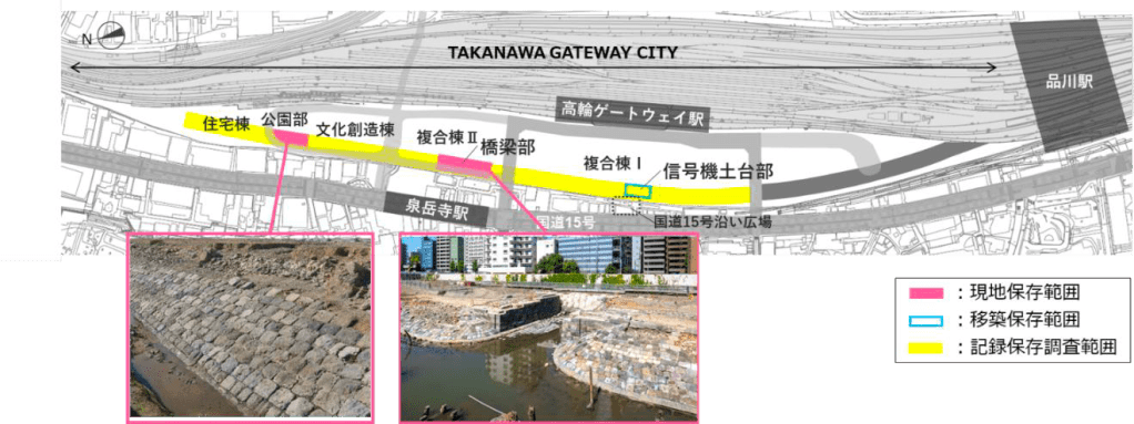 JR東日本の発表によれば、現地保存する箇所は、第7橋梁部と公園部の二箇所となっています。公開時期は、2027年度なので、泉岳寺駅地区第二種市街地再開発事業の開業と同じ時期になるのではと思われます。特に橋梁部は泉岳寺駅地区に隣接するので、そちらからも見ることのできるような工夫がされれば良いなと思います。