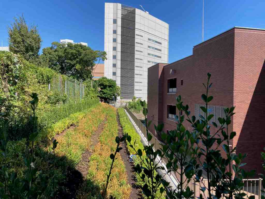 NTTデータ三田ビルの三田台公園側の敷地で行われていた工事ですが、緑化しただけのようなので、崖崩れの防止のための工事なのではないかと思います。