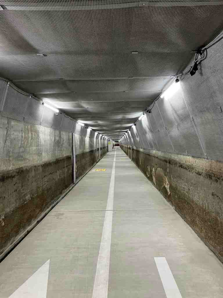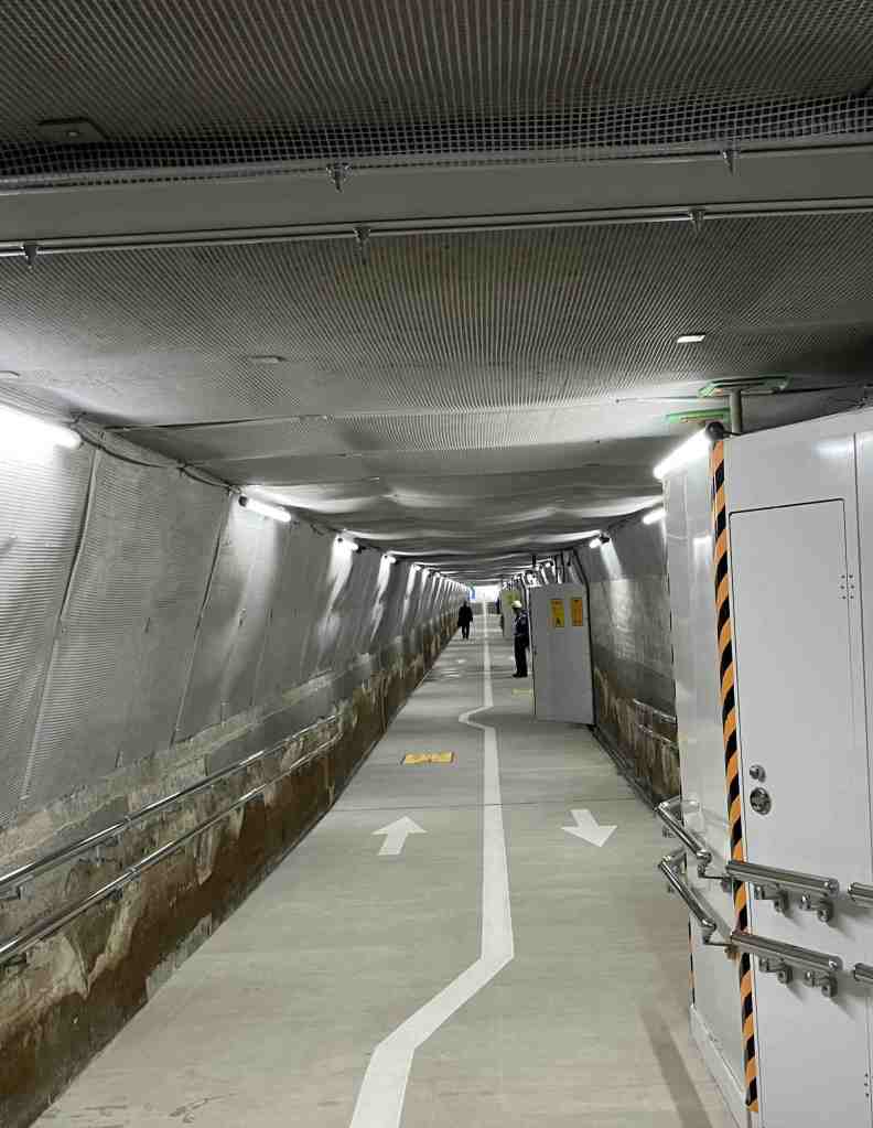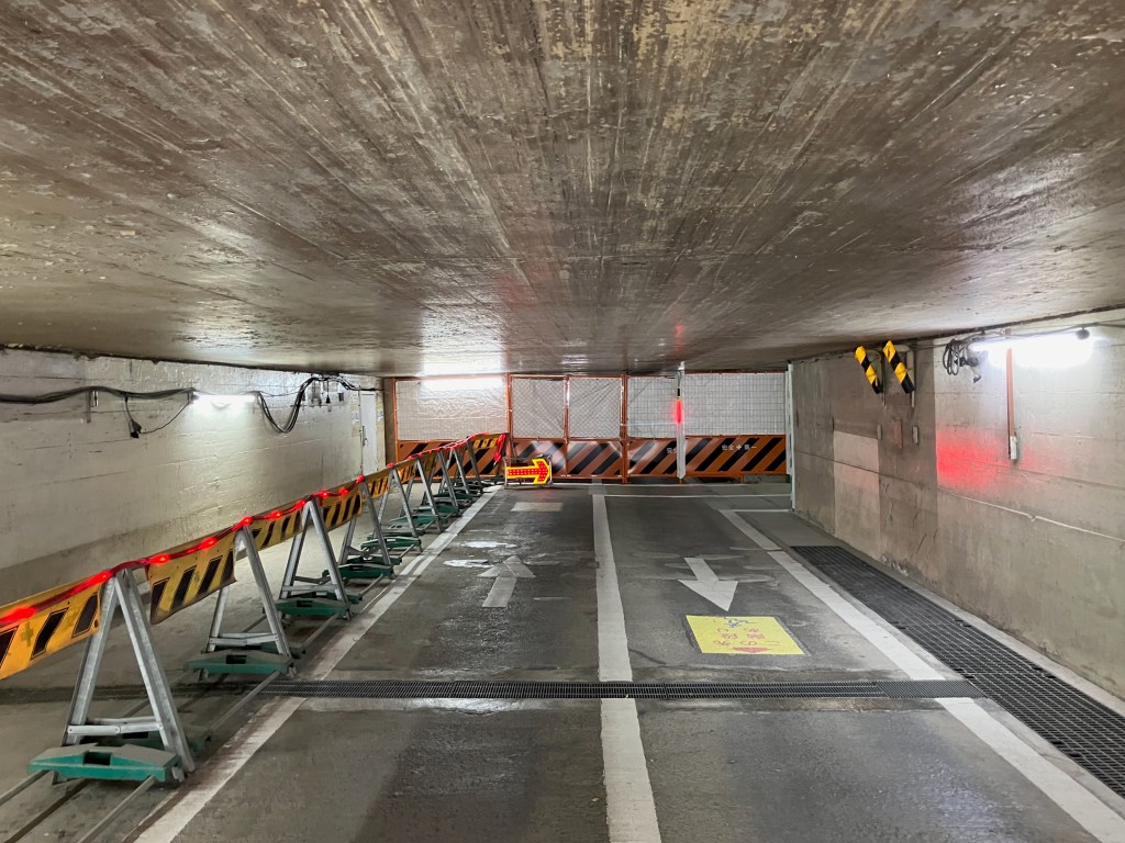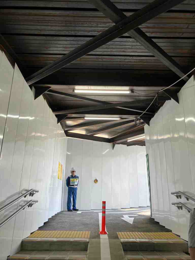 第二東西連絡道路整備工事の歩行者ルートが変更されています。今回の大きな変更点は旧放水渠内通路が整備され、通路の高さが約2.6メートルになったことです。これで屈んで通る必要がなくなりました。(一部、屈む必要があるところも残っていますが。)