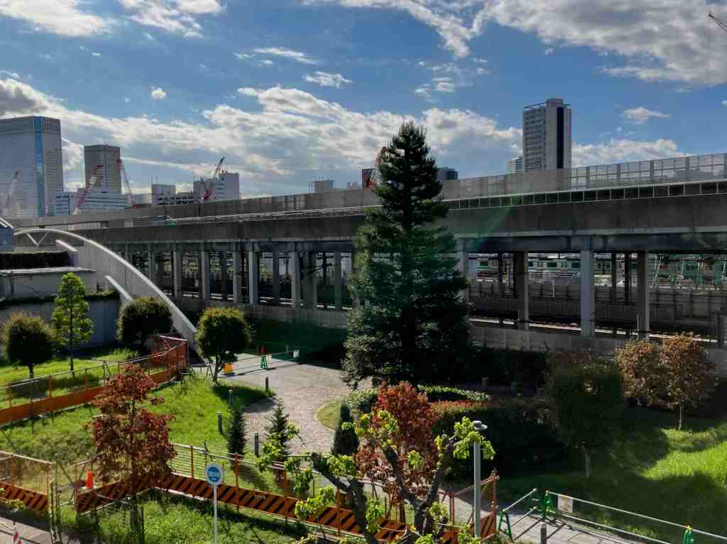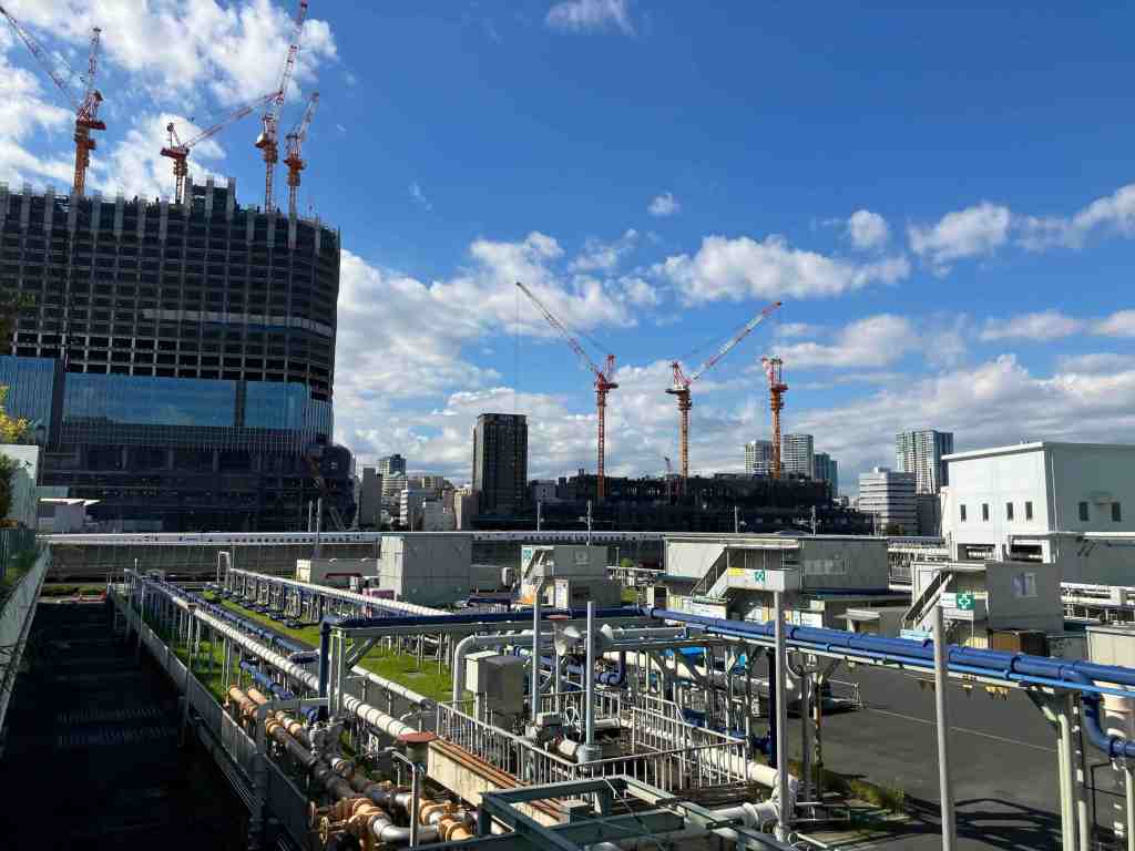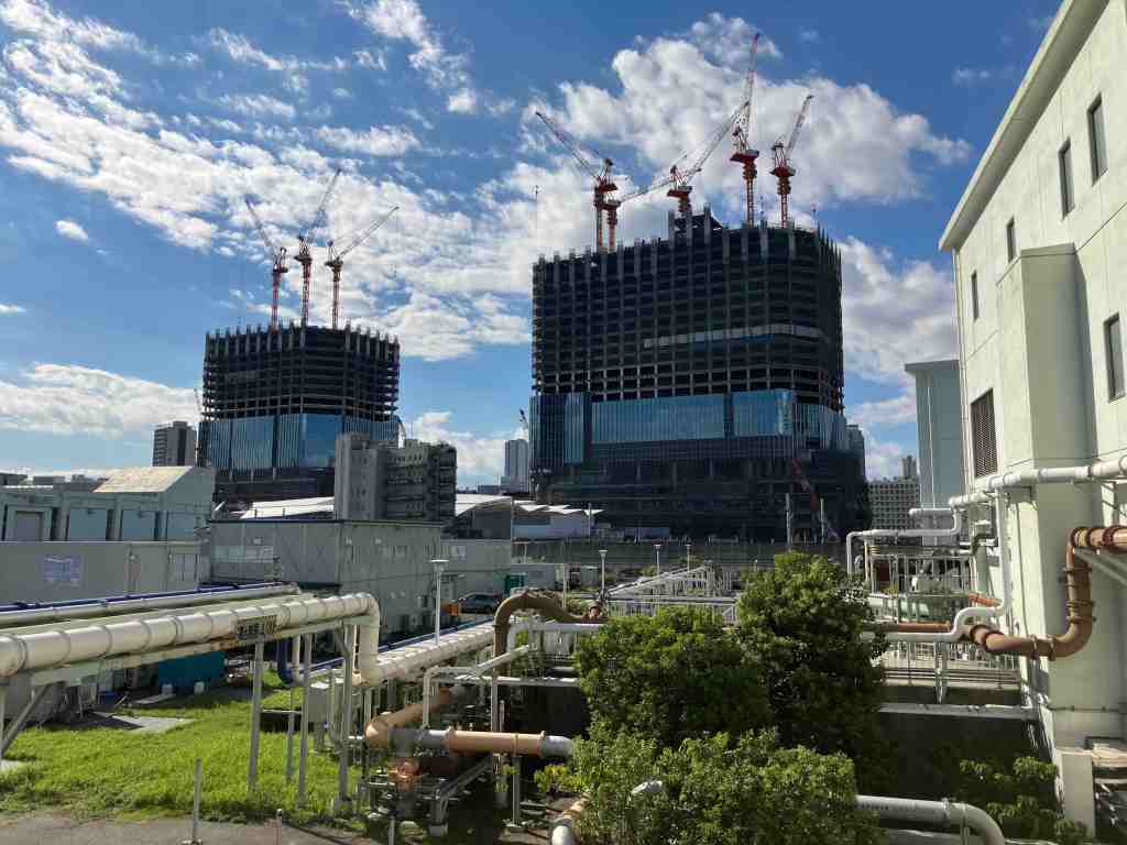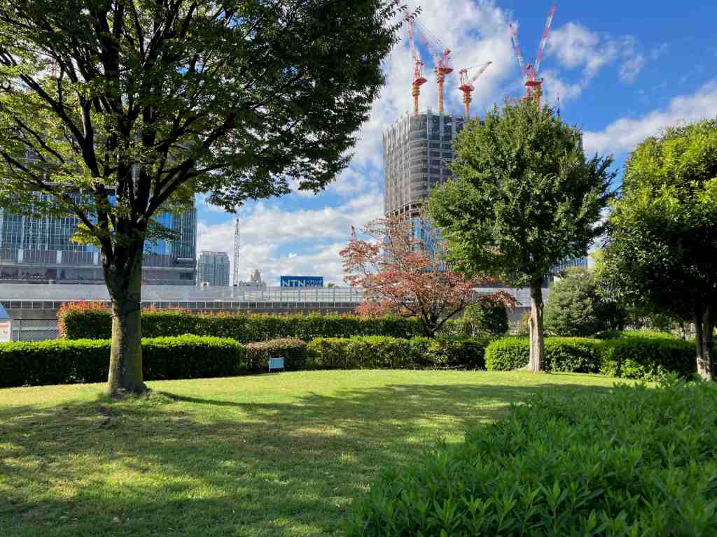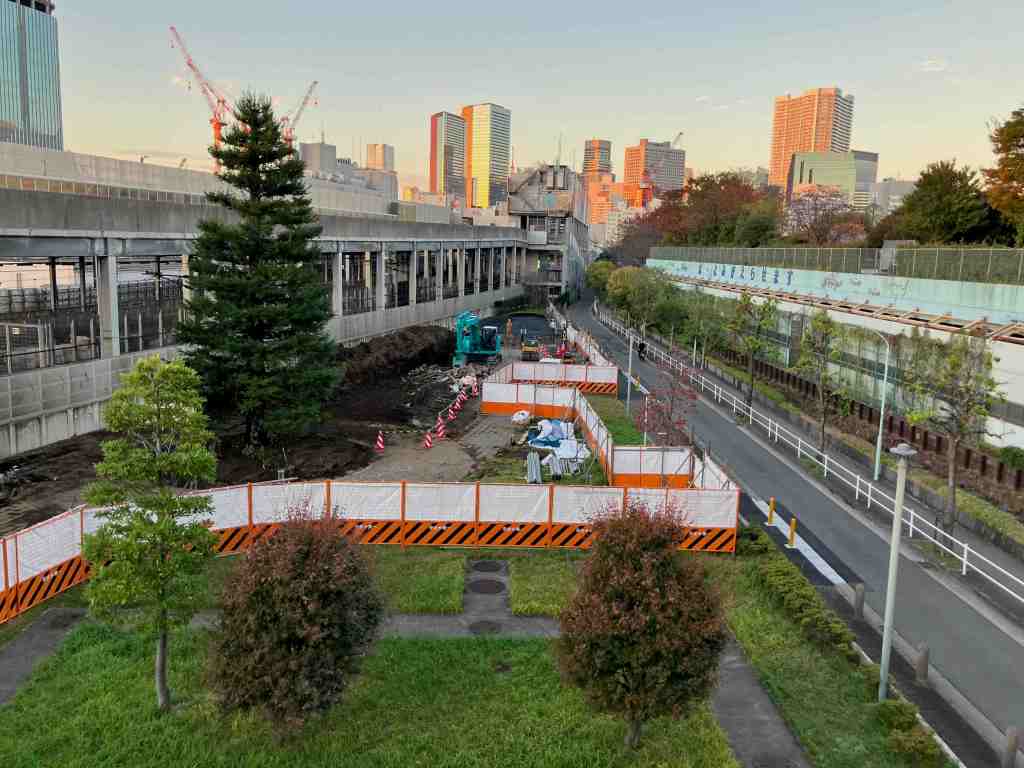第二東西連絡道路整備工事歩行者ルートを抜けて、芝浦中央公園へ向かうとTAKANAWA GATEWAY CITY 複合棟 Ⅰ の工事が見えてきます。