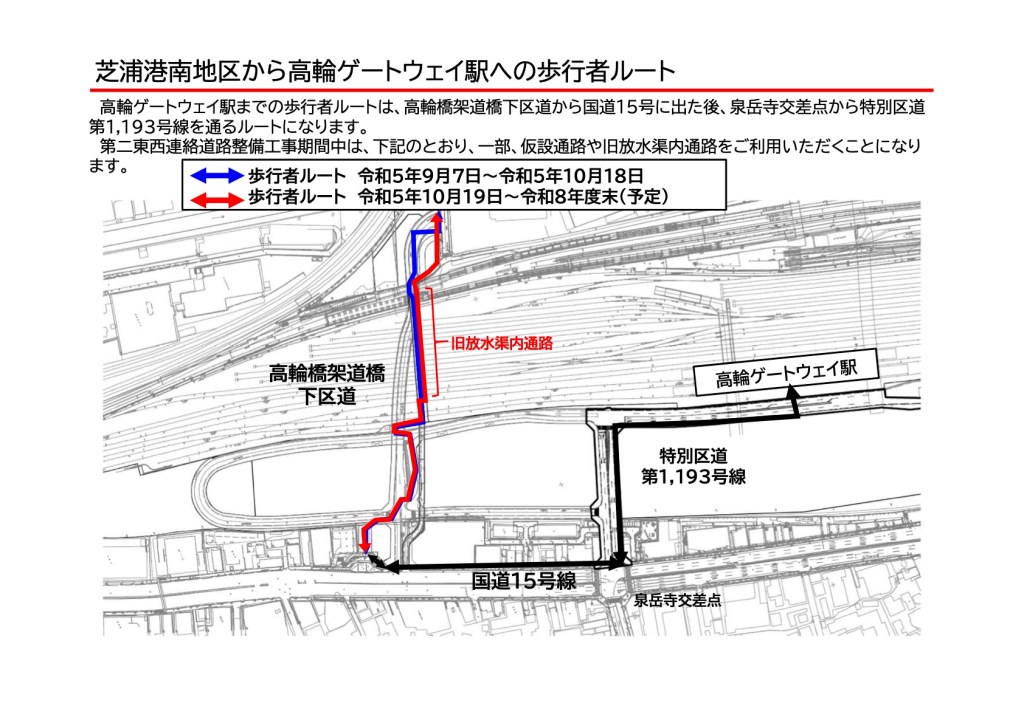 高輪方面の仮設通路からは、TAKANAWA GATEWAY CITY 複合棟Ⅱ、文化創造棟の建設の様子を見ることができます。