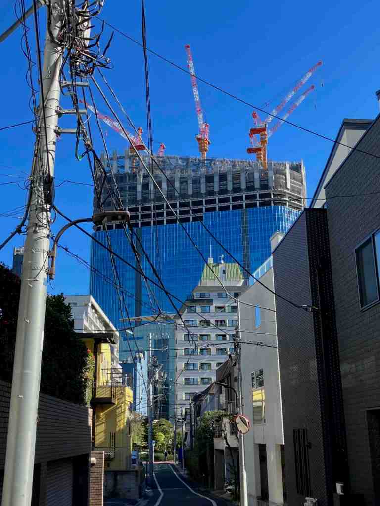正面からみたPMO高輪です。10月末の完成に向け順調に工事が進むと思われます。