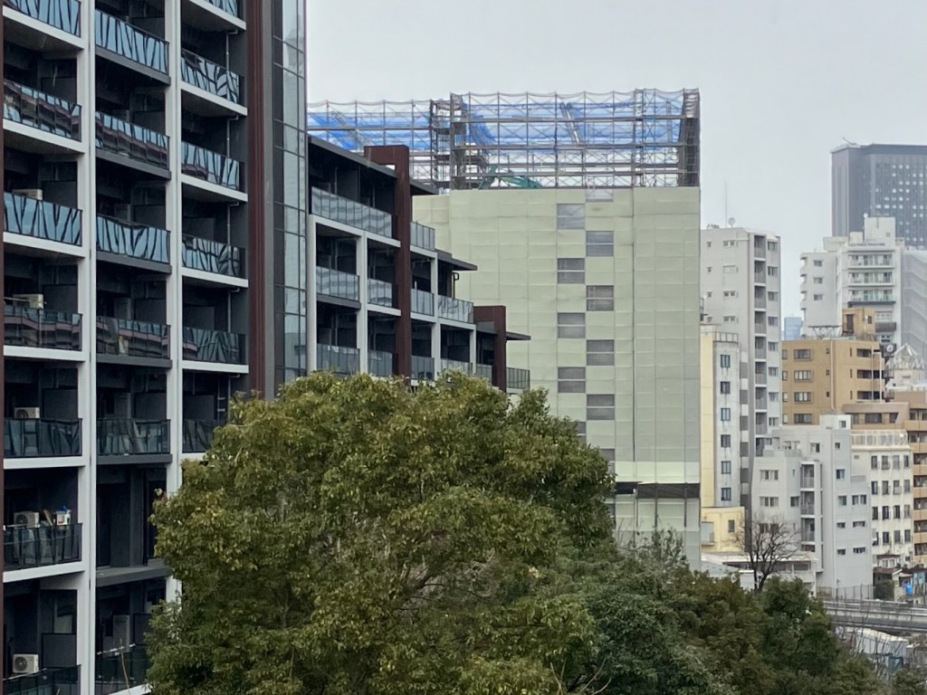 三田三・四丁目地区第一種市街地再開発の完成が遅れています。住宅棟 2は、住友不動産東京三田ガーデンタワーの北東に建設される地上 4 階、地下 2 階の住宅、店舗用の建物で、竣工の予定は2025年3月31日でしたが、間に合いそうもありません。