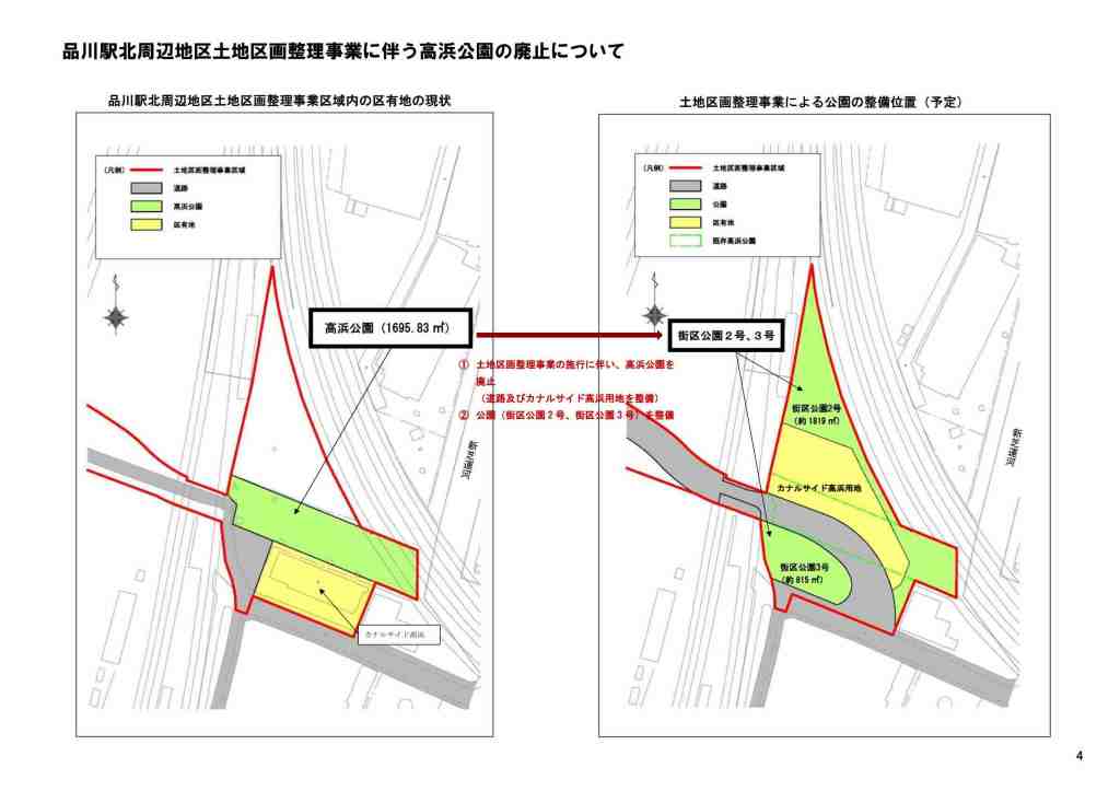 以前、お化けトンネルの芝浦側には、カナルサイド高浜と高浜公園がありました。この高浜公園は新しいカナルサイド高浜を挟む形で、移設される予定なのですが、現在、街区公園2号の開設が予定されている場所には、JR東海の品川電気技術センターがあります。こちらは撤去され、公園になるのだと思われます。